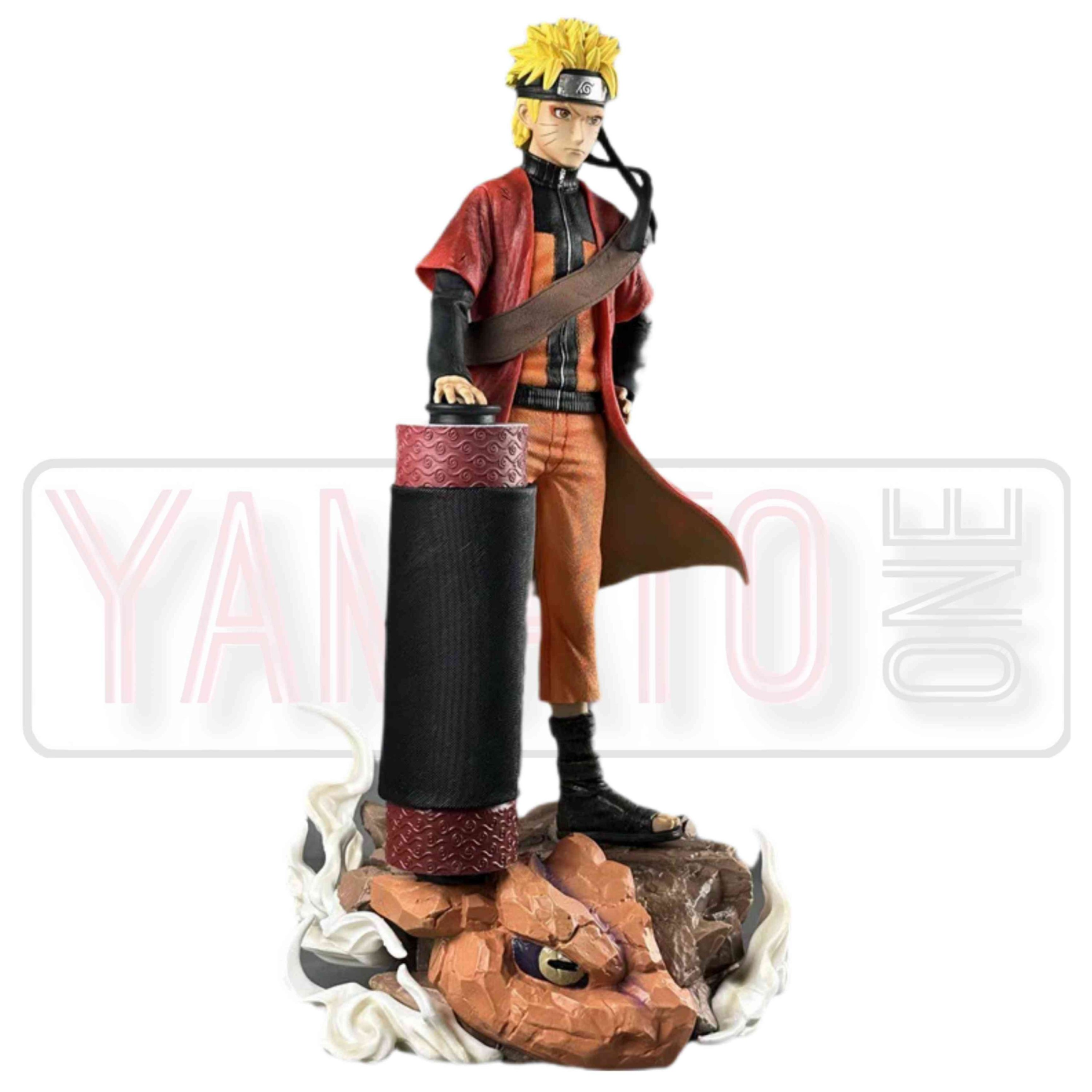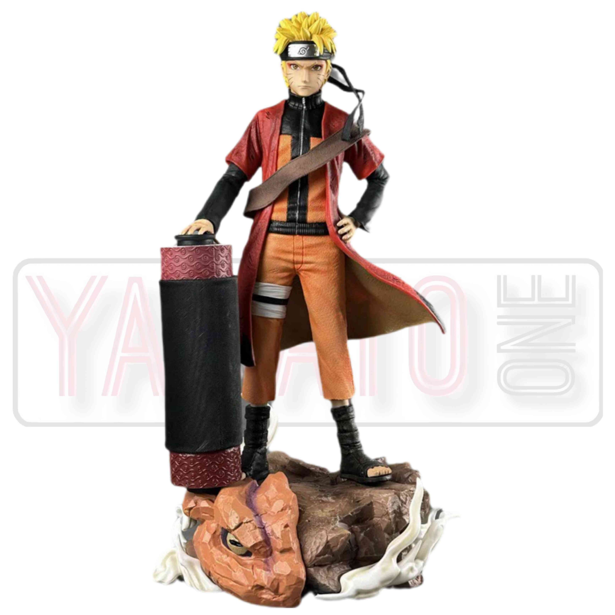 including the character’s signature outfit, facial expression, and a large scroll. Full Figure.